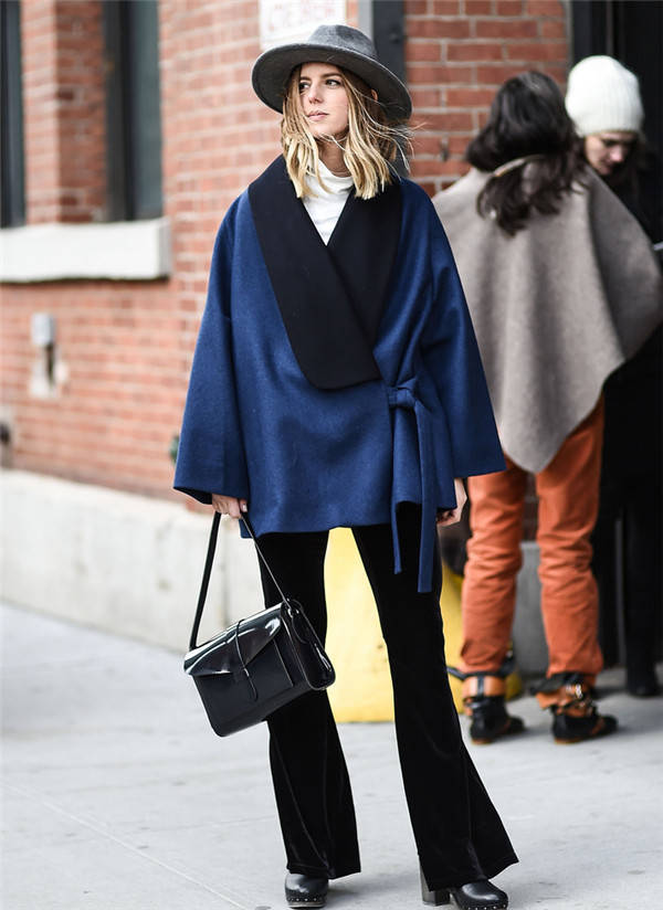 藏蓝色短大衣,内配驼色的毛衣,经典而优雅,还有浓浓的复古风。长长的阔腿裤,走路带风,身材挺拔。