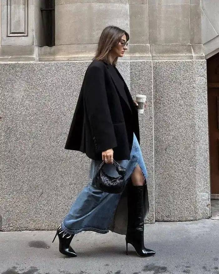 这件黑色半大衣,配蓝色牛仔长裙,也是经典的搭配颜色,既时尚又有休闲的风格,温暖时髦。黑色小包和高筒皮靴,和大衣颜色一样,增加了整体感。这套搭配轻松随意,喝下午茶或者去通勤,都很出彩。