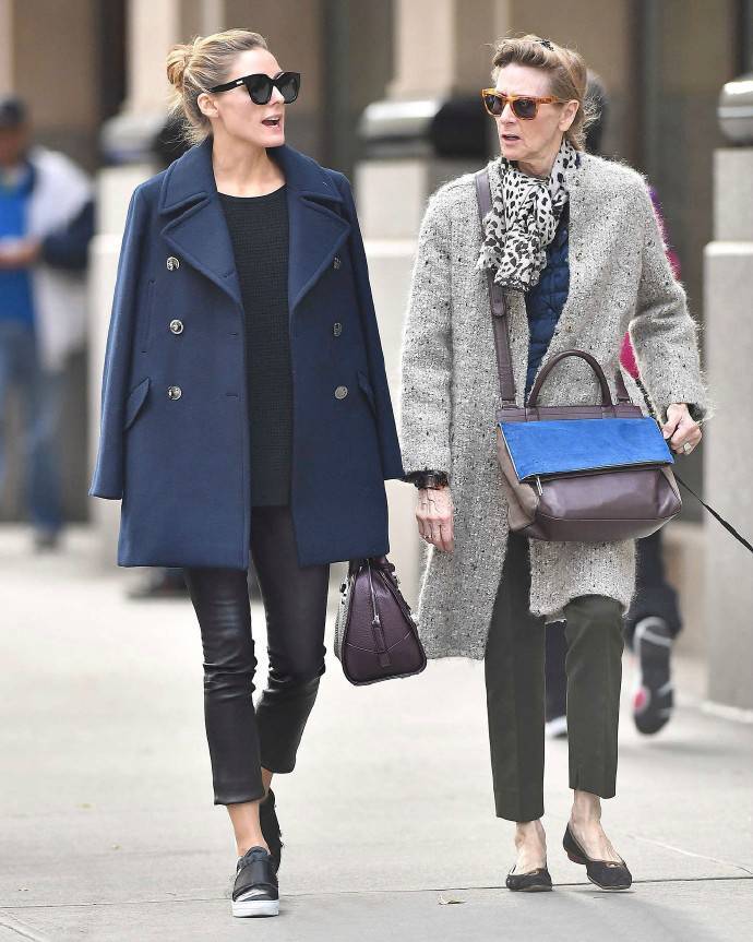 藏蓝色的短大衣,配黑色紧身裤,内搭黑色毛衫,经典稳重,外松内紧的搭配更显身材,显高显瘦。