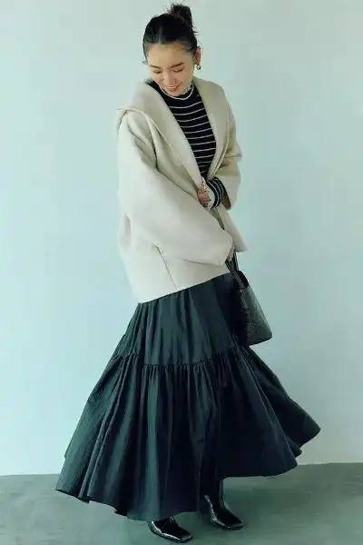 也或者象这样,米白色的连帽短大衣,配黑色的伞裙,黑白的经典配色,高级又时尚,百搭不出错,最美的就是那一低头的温柔,轻轻扬起的裙摆,符合所有对浪漫的想象。