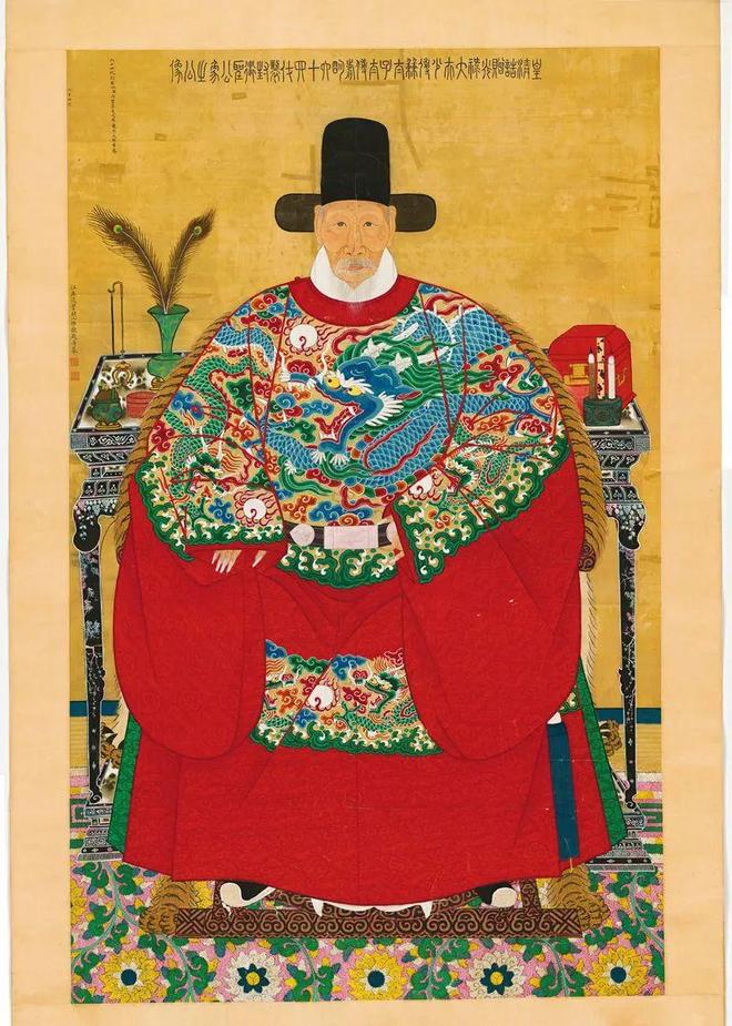 忠静冠仿古玄冠, 服仿古玄端服,色用深青,以纻丝、纱、罗为之,衣上纹样三品以上用云,四品以下用素,边缘以蓝青,深衣用玉色,忠静服补子依常服纹样区分品级。